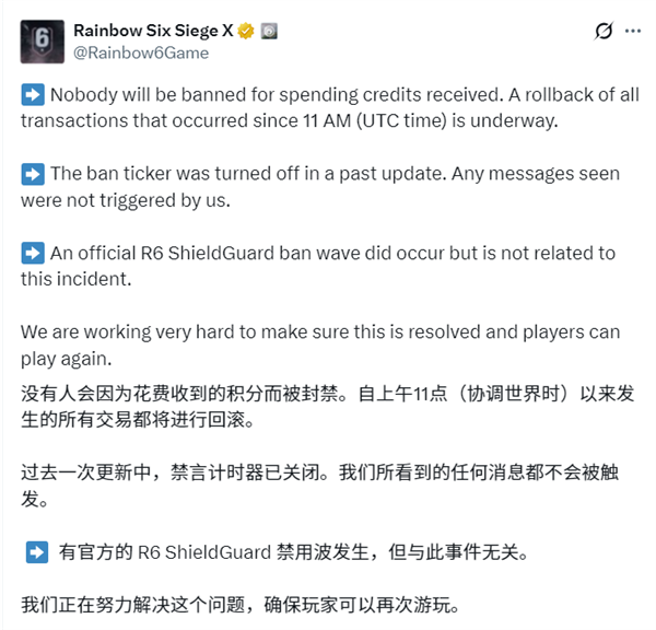 与此同时,服务器内出现了大范围的随机封禁与解封潮,连知名主播的账号也未能幸免。少有一组黑客利用《彩虹六号:围攻》后端服务器的漏洞,取得了封禁权限和物品修改能力,向玩家账号发放了巨额游戏货币,总金额估算高达339万亿美元同等价值。